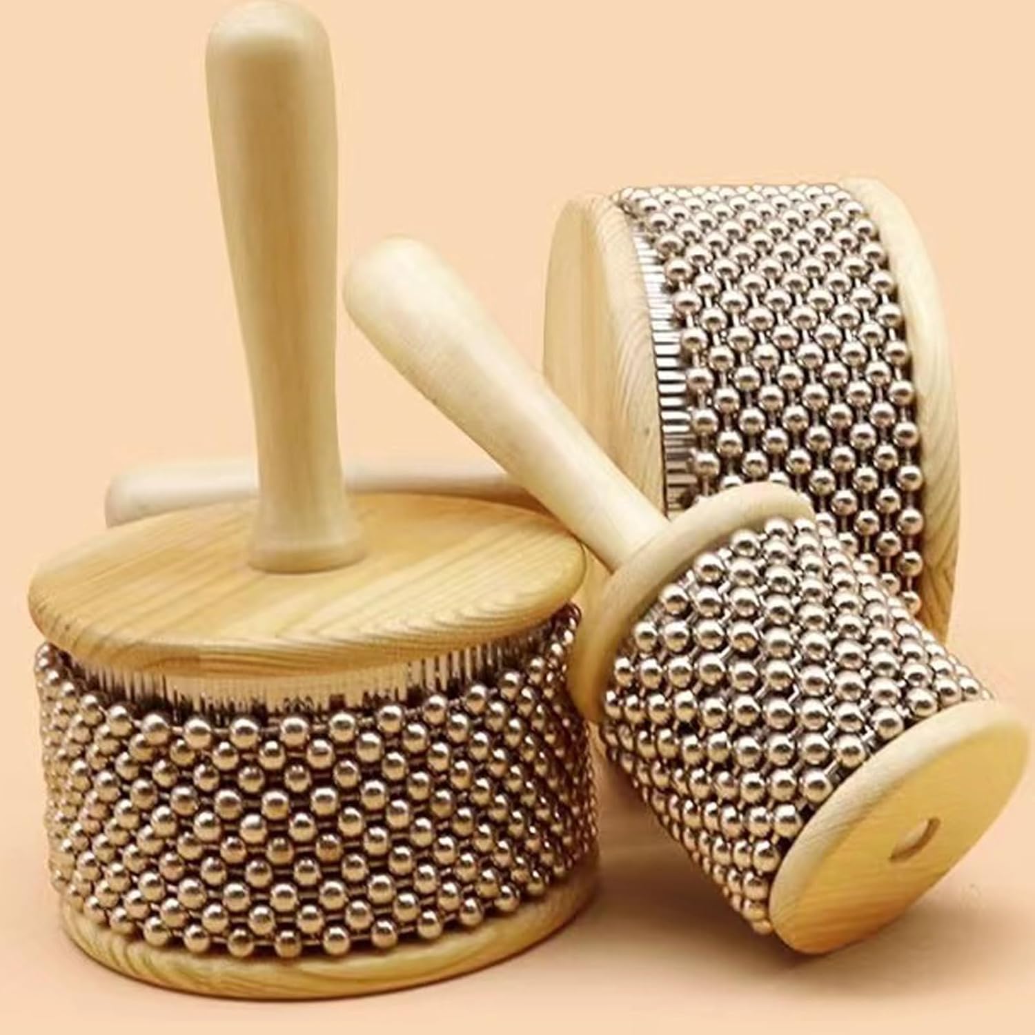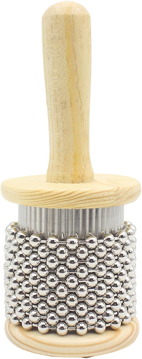 Wooden Cabasa Percussion Musical Instrument Metal Beaded Chain and Cylinder Pop Hand Shaker for Band Music Education 3.5inch,